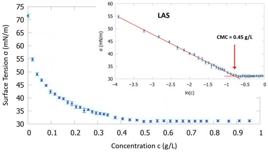 The results of the surface tension measurements in the NaCl solution (500 mg/L Cl− and pH 5.9) at 30 °C are presented in Table 2 and an exemplary measurement curve is shown in Figure 3 for LAS. The surface tension decreases with increasing LAS concentration. The inlay in Figure 3 shows the same plot with logarithmic scale and the linear fits resulting in a CMC of 0.45 g/L.