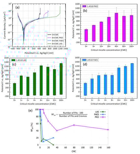 Potentiodynamic polarization results. (a) Typical polarization curves without and with surfactants. (b–d) Bars represent the passive region from the lower end = corrosion potential (Ecorr) to the upper end = anodic breakdown potential (Ebd) for different concentrations of (b) PKO (c) LAS and (d) FAES in NaCl solution (500 mg/L Cl− and pH 5.9 at 30 °C) with 1.4510 as WE. (e) relative frequency of pits RFpit on the stainless steel surface after polarization.