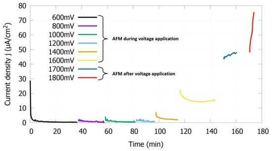 The following results were obtained as described in the measurement methods Section 2.2. Figure 5 shows a representative curve of the current density for the in-situ AFM experiments. Depicted is the current density at different potential differences (vs. Ag/AgCl) for the 1.4510 in the AFM electrochemistry cell, filled with NaCl solution (500 mg/L Cl− and pH 5.9 at 30 °C) with LAS at 16×CMC. For potential differences below the breakdown potential, the current density remains nearly constant. In these cases, the stainless steel was imaged with the AFM while the voltage was applied. However, when the current density increased rapidly over time, the voltage was switched off and the surface was imaged afterwards. Accordingly, as indicated in Figure 5, the surface was imaged up to and including 1600 mV during voltage application and at 1700 and 1800 mV after the voltage was applied.