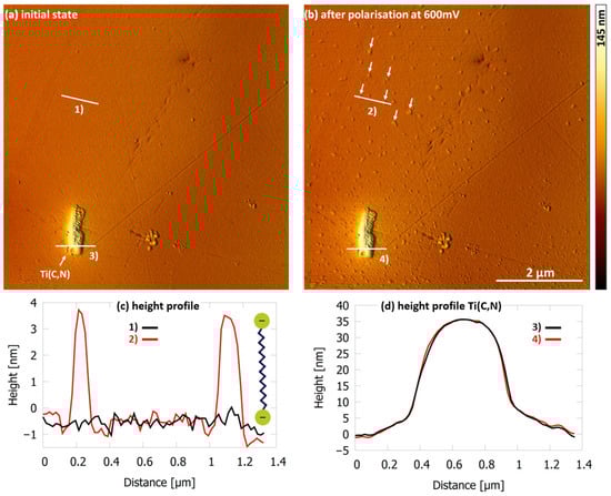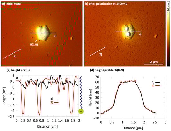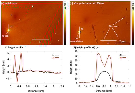 AFM height image of 1.4510 steel surface in NaCl solution (500 mg/L Cl− and pH 5.9 at 30 °C) with LAS at 16×CMC (a) in the initial state after immersion (0 mV), showing no adsorbed molecules of LAS. (b) After reaching 75 µA/cm2 at 1800 mV vs. Ag/AgCl, localized adsorption of LAS at pitting initiation sites, especially at the Ti(C,N) can be seen. (c) Height profiles of indicated cross section (1) and (2). (d) Height profiles of the Ti(C,N) at indicated cross section (3) and (4).