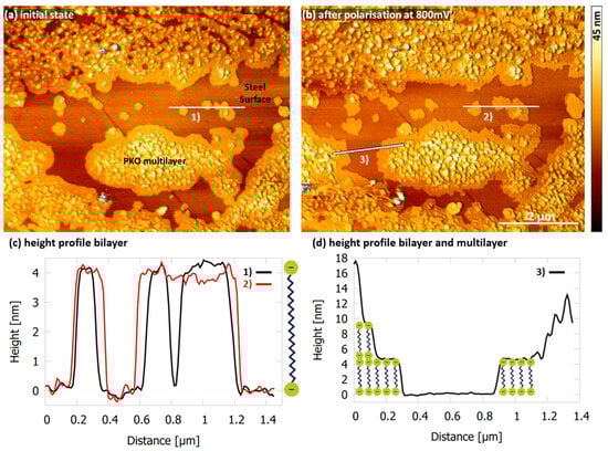 If the concentration is increased to 16×CMC, PKO already covers large areas of the stainless steel sample after immersion (Figure 8a). The potentiostatic polarization of the stainless steel at 16×CMC had the same effect as at 8×CMC. No additional adsorption of molecules could be detected as long as the current remained constant over time. But the surface coverage increased by about 8% after the current density increased over time, reaching 55 µA/cm2 at 800 mV vs. Ag/AgCl (Figure 8b). Bilayers can be observed again as well as the formation of multilayers as indicated by the height profiles (Figure 8c,d). The formation of these multilayers appears to be energetically more favourable than further lateral expansion to cover additional areas of the stainless steel surface. The preferential multilayer formation could also be observed at higher concentrations (Figure S5).
