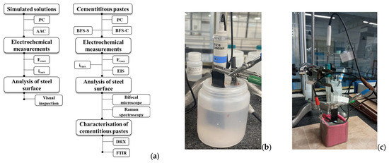 (a) Research diagram and electrochemical testing setups (b) in simulated cement pore solutions and (c) in cementitious pastes.