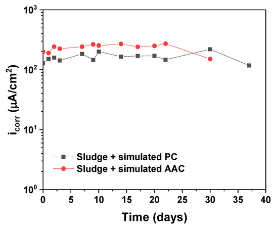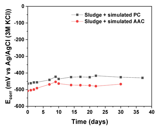 In hydrated cement pastes, the alkaline environment of the pore solution can protect steel bars against corrosion by forming a thermodynamically stable layer of corrosion products less than 10 nm thick on its surface that can passivate and protect the steel [22,23]. The corrosion potential (Ecorr) and corrosion current density (icorr) values are important parameters for characterising the surface condition, passivation, and corrosion processes of steel, in this case, in contact with the acidic sludge in a simulated reference sample based on Portland cement (CP) and in simulated alkali-activated cements (AACs). Figure 4 shows the evolution of the Ecorr for the carbon steel sheets submerged in simulated PC and AAC pore solutions mixed with the decontamination sludge. Evidently, the Ecorr was very negative from the beginning of the test, with values of around −416 mV to −460 mV (note that all Ecorr values are given relative to the Ag/AgCl (3M KCl) reference electrode) in the simulated PC solution and −453 mV to −507 mV in the simulated AAC solution. These values indicated that the very acidic pH of both solutions (pH = 2.7 and 3.8 for the PC and AAC solutions, respectively) prevented a passive layer from forming on the steel surface and induced a very active corrosion of the steel starting on the first few days, even causing the steel to break when immersed in the simulated AAC solution after 37 days of testing.