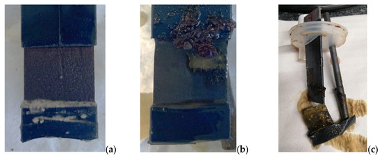 A visual inspection of the carbon steel sheets was carried out throughout the test to ascertain the effect of the presence of the decontamination sludge on the steel surface. Figure 6 shows photographs of the surfaces of the working electrodes after 25 and 37 days. After 25 days of exposure, the surfaces of both steels submerged in PC and AAC solutions had darkened due to the formation of corrosion products induced by the acidic pH, as corroborated by the Ecorr and icorr values obtained in the electrochemical measurements (see Figure 6a and Figure 6b, respectively). Finally, at 37 days, there was also a decrease in mass, indicated by the decrease in the thickness of the carbon steel sheets (as shown in Figure 6c), causing the steel to break.
