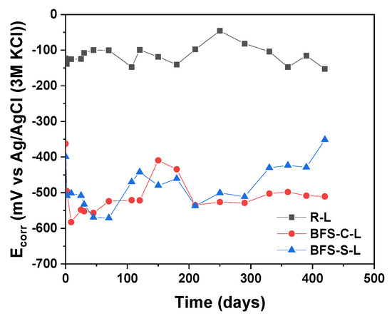 The evolution of the corrosion potential (Ecorr) values as a function of time for the carbon steel sheets embedded in the R-L, BFS-C-L, and BFS-S-L pastes after 28 days of curing.