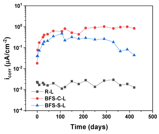 Evolution of corrosion current density (icorr) values as a function of time for the carbon steel sheets embedded in the R-L, BFS-C-L, and BFS-S-L pastes after 28 days of curing.