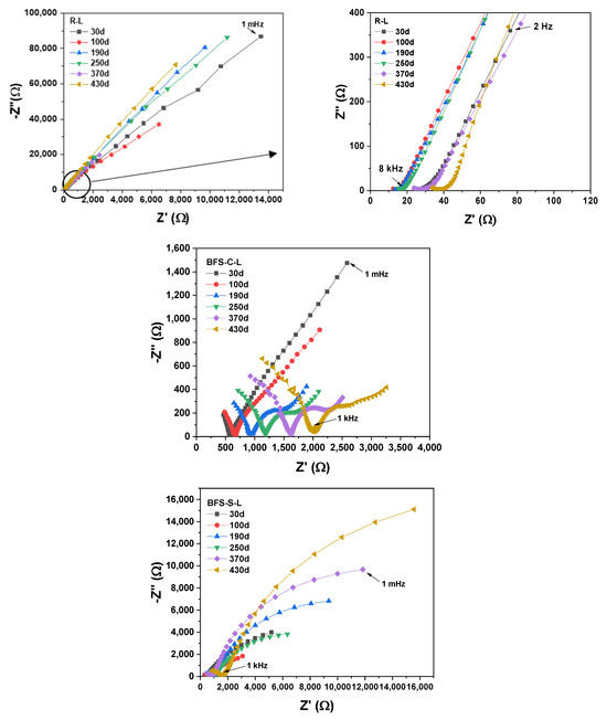 Figure 9 shows the Nyquist plots recorded for the R-L, BFS-C-L, and BFS-S-L pastes after 430 days. Evidently, only the low-frequency capacitive loop was obtained in the testing frequency range, which was between 8 kHz and 1 mHz for the reference paste and between 1 kHz and 1 mHz for the alkali-activated pastes. In general, these capacitive loops of the R-L and BFS-S-L pastes became larger over time. However, for the BFS-C-L paste, the capacitive loops clearly decreased over time even though a tail of diffusion was detected starting at the beginning of the test. The impedance response collected at low frequencies may be associated with the carbon steel corrosion process.