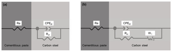 Equivalent circuit models used for the EIS results for carbon steel embedded in (a) the R-L and BFS-S-L pastes and (b) the BFS-C-L pastes.