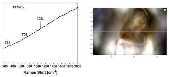 Figure 12 shows the Raman spectrum and the selected area of the deposits on the steel surface of the BFS-C-L sample mixed with the decontamination sludge. This spectrum presented three sharp signals around 1083, 706, and 281 cm−1. The peaks at 1083 (the most intense) and 706 cm−1 are associated with the internal modes of the carbonate ion, symmetric stretching, and in-plane bending vibrations of CO32− groups, respectively, confirming that carbonates formed in the sodium carbonate-activated slag paste [31,32]. The peak at 281 cm−1 was assigned to hematite (α-Fe2O3) since this compound is characterised by the following bands in the Raman spectrum: 228, 244, 296, 413, 497, 611, 659, and 819; the band at 296 cm−1 is the most intense [33,34]. Therefore, the Raman results confirmed that the corrosion of the steel began in the BFS-C-L sample with the formation of corrosion products on its surface, corroborating the results obtained through the electrochemical measurements.