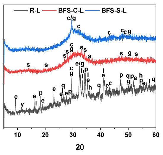 XRD patterns of the R-L, BFS-C-L, and BFS-L pastes mixed with the decontamination sludge after 28 days of curing. g: gel; p: portlandite; e: ettringite; y: gypsum; c: calcite; s: gaylussite; q: quartz; l: mullite; h: hematite.