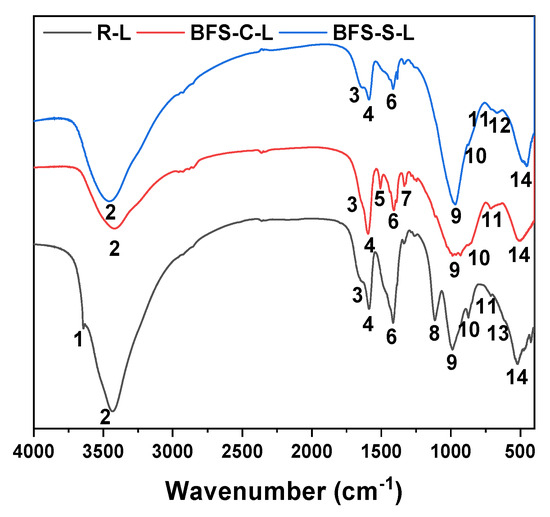 FTIR spectra of the R-L, BFS-C-L, and BFS-L pastes mixed with the decontamination sludge after 28 days of curing.