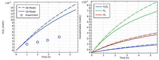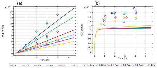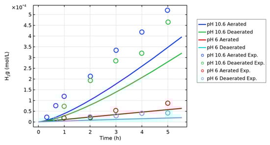 There is a significant amount of scatter in the experimental H2O2 measurements, with no consistent trend with the Vg:Vaq. Similarly, apart from the ratio of 4:1, the model predicts relatively little variation in the dissolved [H2O2] on the Vg:Vaq ratio. Yakabuskie et al. [17] also compared their H2O (FACSIMILE) model to the experimental data in Figure 2 and Figure 3 and predicted good agreement between measured and predicted H2 concentrations at pH 6, although their agreement at pH 10.6 appears qualitatively to not be as good as that shown in Figure 3a. However, the H2O (FACSIMILE) model predictions for H2O2 were superior to those found for the H2O (COMSOL) model at both pH values.
