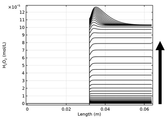Predicted concentration profiles for H2O2 in the solution layer for a H2O (COMSOL) simulation of the radiolysis of pH 6 aerated H2O at a dose rate of 9 kGy/h with a Vg:Vaq ratio of 1:1. For the 1D model, the interface between the gas and solutions layers is located at a length of 0.03185 m, with the gas layer to the left and the solution layer to the right. Profiles are shown for various simulation times between 0 h and 6 h, increasing in the direction of the arrow.
