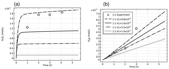 Sensitivity analysis of the dependence of the predicted time-dependent (a) dissolved H2O2 and (b) gaseous H2 concentrations on the value of the rate constant for the reaction between the solvated electron (•eaq−) and H2O2 (k1). Results shown for the radiolysis of initially aerated H2O at pH 6 in an open system with a Vg:Vaq ratio of 1:1 at a dose rate of 9 kGy/h. Experimental measurements from [16] are also shown for comparison.