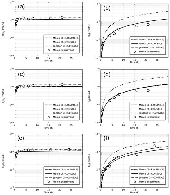 Comparison of the COMSOL implementations of the Morco and Jonsson H2O-Cl radiolysis models. Time dependence of the measured and predicted concentrations of (a,c,e) H2O2 and (b,d,f) gaseous H2 for the radiolysis of initially aerated pure H2O and dilute Cl− solutions at pH 6 and a dose rate of 2.3 kGy/h. Results shown for pure H2O (upper) and Cl− concentrations of 0.001 mol/L (middle) and 0.01 mol/L (lower). COMSOL-based models based on the H2O-Cl− reaction schemes of Morco [10] (Morco Cl− (COMSOL)) and Jonsson [21] (Jonsson Cl− (COMSOL)). Also shown are the corresponding FACSIMILE-based model predictions of Morco [10] (Morco Cl− (FACSIMILE)). Simulations are for a Vg:Vaq ratio of 1:1. Experimental measurements from Morco [10].