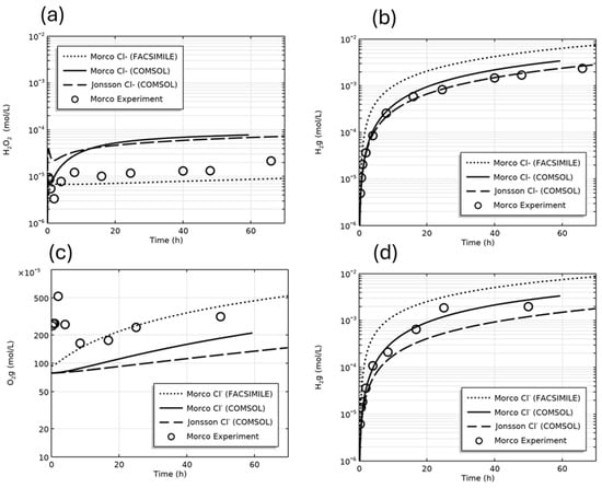 Table 1 summarizes the validation simulations that have been performed as part of the current study. We have validated various COMSOL-based models against experimental measurements of the [H2(g)] and [H2O2(aq)] given by [10,16], including the model for H2O previously described (referred to here as the H2O (COMSOL) model) [6] and two H2O-Cl− models based on reaction schemes from either Morco [10] (Morco Cl− (COMSOL)) (which itself is based on the original model of Christen and Sunder [19] and Bjergbakke et al. [20]) or Jonsson [21] (Jonsson Cl− (COMSOL)) described in Table A1 and Table A2, respectively. We also compare our COMSOL implementation of the Morco Cl− reactions with the original FACSIMILE implementation described in [10] (Morco Cl− (FACSIMILE)). In all cases, partitioning of O2 and H2 between the solution phase and gas headspace is simulated, either using the assumption of equilibrium at the gas–solution interface for the COMSOL models or the mass-transfer resistance model of Yakabuskie et al. [17] in the case of the FACSIMILE model. Various gas:solution volume ratios (Vg:Vaq) have been simulated. Radiolysis is assumed to be limited to the solution phase only with no radiolysis reactions in the headspace. For the simulations involving Cl− solutions, primary g-values for H2O-derived species only were used for [Cl−] up to and including 0.1 mol/L [6], with a separate set of g-values (including values for three additional primary species •Cl2−, Cl3−, and •ClOH−) for 2 mol/L Cl− (Table A3). Finally, various initial pH and [O2] were assumed as defined by the experimental studies [10,16]. In the case of the “low [O2]” solution in Table 1, the initial [O2] was defined as being a factor of 10 lower than that in aerated solution based on the experimental description in [10].