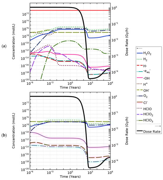 Predicted concentrations of various molecular and radical radiolysis products based on the time-dependent dose rate for a copper-coated used fuel container. Simulations performed using the Morco Cl− reaction scheme (COMSOL) with no headspace for pH 7 deaerated solution for (a) 0.1 mol/L Cl− and (b) pure H2O. Simulations shown for 30-year-old used CANDU® fuel with a burnup of 220 MWh/kgU [6].