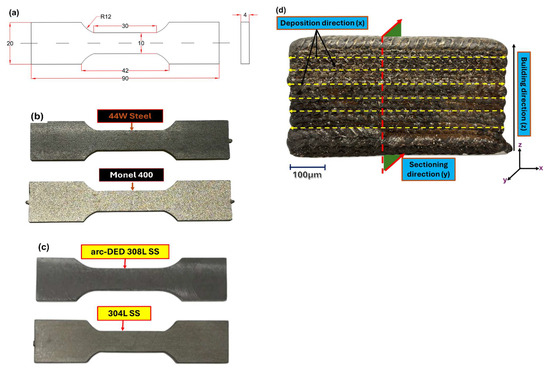 (a) Specimen dimension (in mm); (b) standard 44W steel and Monel 400 specimens; (c) machined arc-DED fabricated 308L austenitic stainless-steel specimen and wrought 304L austenitic stainless steel; (d) side view of arc-DED fabricated 308L austenitic stainless-steel wall.