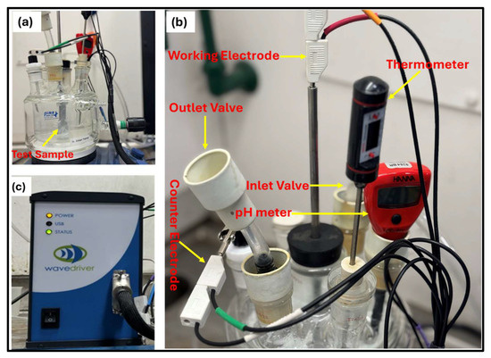 Electrochemical hydrogen charging was conducted on four different materials, 44W steel, Monel 400, 304L austenitic stainless steel, and arc-DED 308L austenitic stainless steel, to explore how hydrogen permeation influences their respective tensile properties. In this process, each specimen served as the working electrode in a two-electrode setup (Figure 2a,b), while a platinum counter electrode completed the circuit. A potentiostat/galvanostat (Figure 2c) system (Pine Research Instrumentation, Durham, NC, USA), capable of delivering a constant current of up to 1 A, was used to regulate the charging process. Hydrogen charging for each sample was maintained for three hours, a duration aligned with the time required to reach steady-state hydrogen absorption, as determined in previous studies [27,50].
