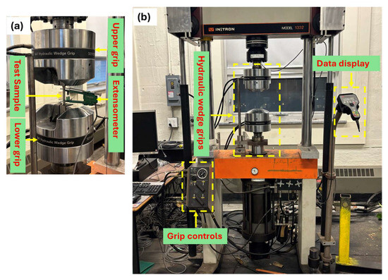 Prior to testing, the specimens were carefully mounted in the upper and lower grips of the Instron 1332 tensile testing machine (Figure 3a,b), ensuring proper alignment using a straight edge to maintain perpendicularity to the grips. A well-calibrated extensometer (Figure 3a) with a 25 mm gauge length was attached to the gauge section of each specimen to accurately monitor and record displacement during testing.