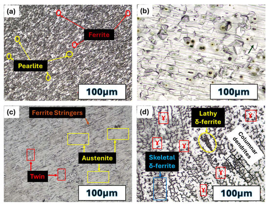 The 304L austenitic stainless steel (Figure 4c) revealed microstructural features including twin boundaries, equiaxed austenitic grains and ferrite stringers, and elongated ferrite regions dispersed within the austenitic matrix. The detection of the ferrite stringers suggests localized microstructural heterogeneities, likely originating from variations in chemical composition or thermal processing during fabrication. Microstructural analysis of the arc-DED fabricated austenitic stainless steel (Figure 4d) revealed a combination of lathy delta ferrite, skeletal delta ferrite, and columnar dendrites, features that reflect the interplay of rapid solidification dynamics, localized compositional variations, and steep thermal gradients inherent to the arc-DED process. Lathy delta ferrite (Figure 4d) refers to elongated, plate-like ferrite structures formed within the austenitic matrix due to rapid solidification and steep thermal gradients in AM processes. These features arise when ferrite-stabilizing elements like chromium promote delta ferrite formation during directional solidification. Skeletal delta ferrite appears as a branching network retained in the austenitic matrix, resulting from non-equilibrium conditions and localized compositional variations that prevent full transformation to austenite. Both morphologies reflect the rapid cooling and complex thermal profiles inherent in arc-DED fabrication [82,83].