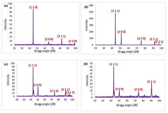 X-Ray diffraction pattern of (a) 44W steel; (b) Monel 400; (c) 304L austenitic stainless steel; (d) arc-DED 308L austenitic stainless steel.