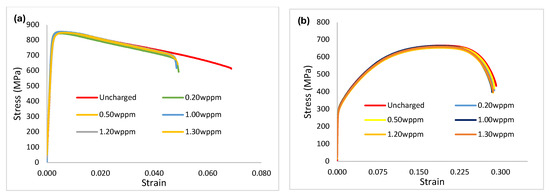 Uniaxial tensile testing was conducted immediately following the completion of electrochemical hydrogen charging. The average time interval between the removal of specimens from the charging cell and the initiation of tensile testing was approximately 2–3 min, which accounted for specimen handling and setup within the tensile testing grips. This brief time was consistent across all specimens and all hydrogen charging levels, ensuring uniformity in hydrogen exposure conditions prior to mechanical testing.