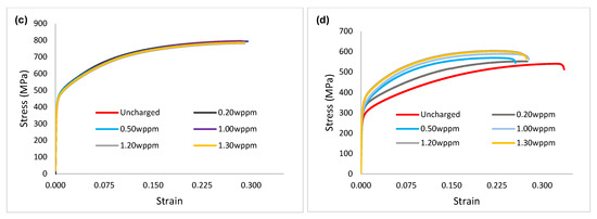 Stress–strain behaviors of specimens at specified hydrogenating conditions: (a) 44W steel; (b) Monel 400; (c) 304L austenitic stainless steel; and (d) arc-DED 308L austenitic stainless steel.