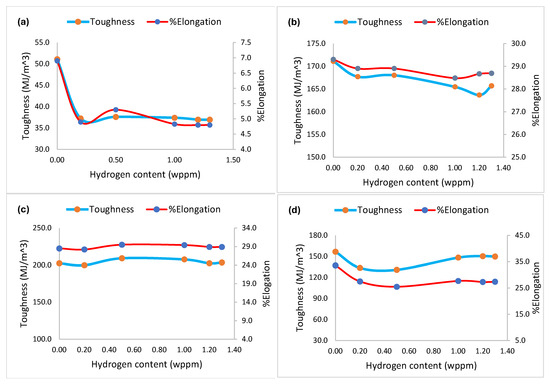 Relationship between %elongation and toughness against hydrogen permeation levels: (a) 44W steel; (b) Monel 400; (c) 304L austenitic stainless steel; and (d) arc-DED 308L austenitic stainless steel.