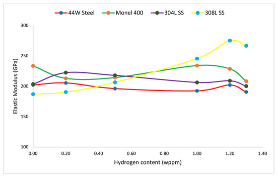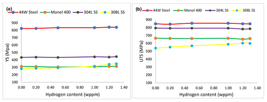Toughness was calculated as the area under the engineering stress–strain curve up to the point of fracture. To compute this area, a custom function based on the trapezoidal numerical integration method was implemented. The %elongation and toughness of the four materials under hydrogenating conditions exhibited varying behaviors: 44W steel experienced significant reductions, Monel 400 showed a relatively smaller reduction, 304L austenitic stainless steel demonstrated the highest resilience to hydrogen diffusion, and arc-DED 308L austenitic stainless steel displayed an initial reduction followed by a subsequent improvement in these properties.