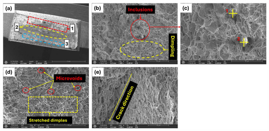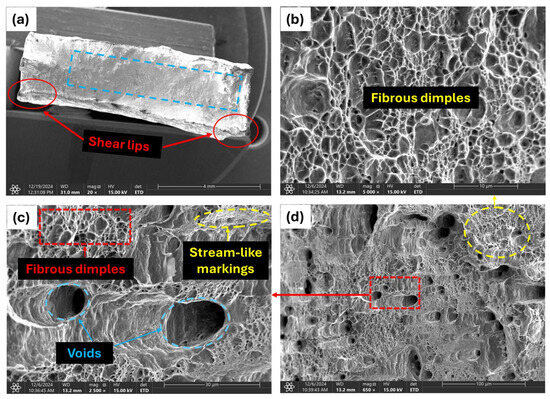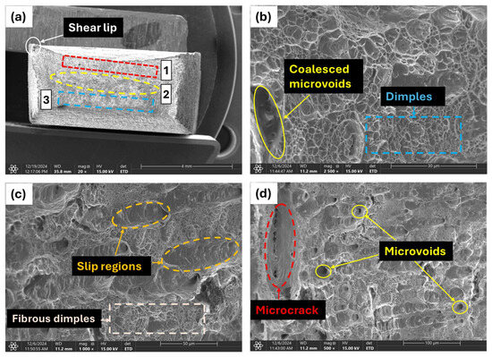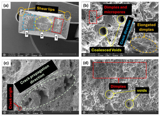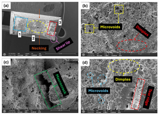 The tensile tests were conducted at a constant crosshead speed of 5 mm/min, corresponding to a strain rate of 0.2 min−1. The specimens were subjected to this strain rate until failure, ensuring uniform testing conditions for comparative analysis. Analysis of the collected data described the variations in tensile strength, elongation, and fracture behavior due to the presence of hydrogen, facilitating an in-depth understanding of HE mechanisms under different hydrogen charging levels.