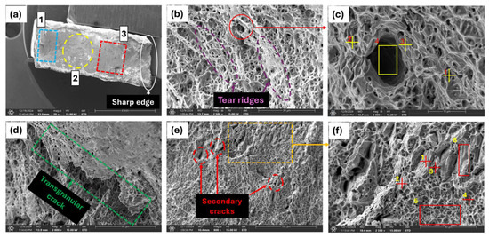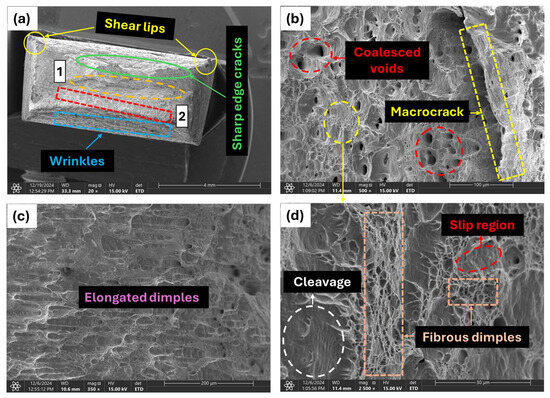 The behavior of 304L austenitic stainless steel (Figure 6c) under hydrogen charging was particularly noteworthy, as its elongation and toughness remained virtually unchanged, with the former changing slightly from 28.5% to 28.9% and the latter from 202.51 MJ/m3 to 203.56 MJ/m3. This stability suggests that hydrogen may play a role in stabilizing the FCC lattice or relieving internal stresses, thereby preserving both ductility and toughness. These findings indicate that 304L maintains its mechanical integrity across all levels of hydrogenating conditions, showing performance consistent with its uncharged counterparts. On the other hand, the arc-DED 308L austenitic stainless steel (Figure 6d) showed a moderate reduction in performance upon hydrogen charging. Its elongation decreased from 33.6% to 27.4%, and its toughness dropped from 156.74 MJ/m3 to 149.92 MJ/m3. These reductions, though less severe than those observed in 44W steel, are more pronounced than in conventional 304L austenitic stainless steel. The increased susceptibility of the arc-DED fabricated material to the HE is likely due to microstructural characteristics inherent to AM, such as residual stresses, certain defects, and structural discontinuities, which can act as hydrogen trapping sites and intensify embrittlement.