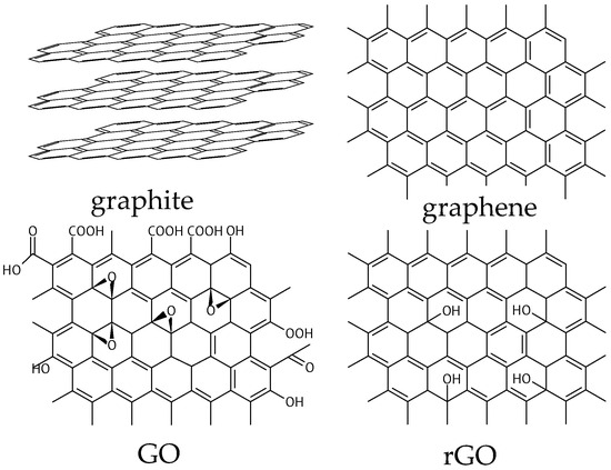 Chemical structures of graphite, GR, GO, and rGO. flG is not shown because its sketch would be highly similar to that of graphite (see also [1]).