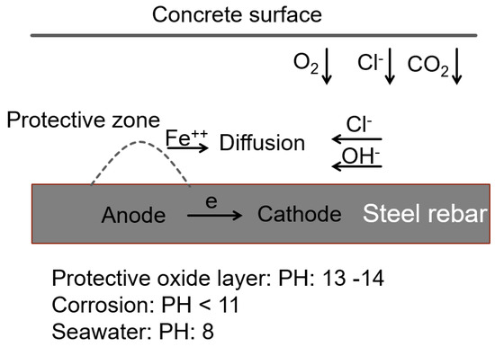 During the initiation period, a passive layer—primarily composed of iron oxides—naturally forms on the steel surface in the highly alkaline pore solution of concrete (pH > 12.5). This passive film provides temporary protection against corrosion. However, its stability is compromised when chloride ions from external sources (e.g., seawater or de-icing salts) or carbonation reduce the local alkalinity. Once the chloride concentration at the rebar surface exceeds a critical threshold or the pH drops sufficiently, the passive layer breaks down, marking the onset of active corrosion [6,7].