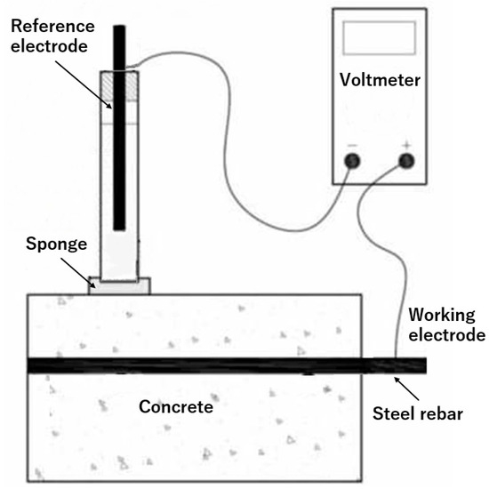 Half-cell potential (HCP) measurement is also called open-circuit potential (OCP) measurement, which is a widely used non-destructive technique to assess the corrosion activity of steel reinforcement in concrete structures [11,12]. Figure 2 shows a schematic diagram of the technique. It measures the electrical potential difference between the embedded steel and a standard reference electrode placed on the concrete surface. The technique is based on electrochemical principles. When steel corrodes in concrete, electrochemical cells are formed, creating anodic (corroding) and cathodic (non-corroding) regions.