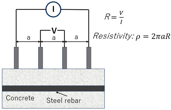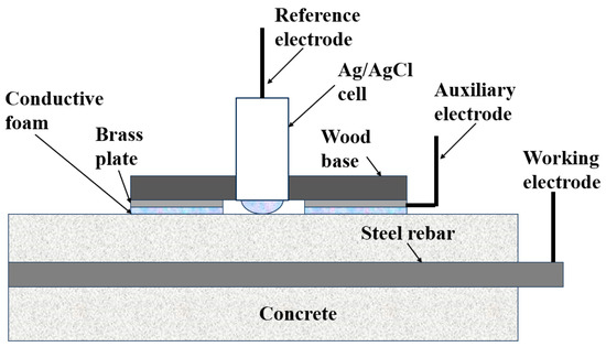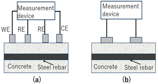 To avoid having to connect directly to the steel rebar, some researchers have investigated an indirect approach employing a four-electrode or two-electrode configuration [32,33], as shown in Figure 6.