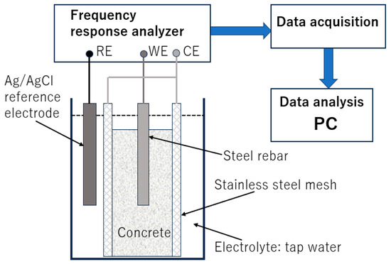 Electrochemical impedance spectroscopy (EIS) is a powerful, non-destructive electrochemical technique used to investigate the corrosion mechanisms and kinetics of metal in an electrolyte [25,26]. In standard laboratory practice, EIS is performed using a three-electrode configuration. Figure 5 shows the setup [27]. The reinforcing steel acts as the working electrode (WE). A reference electrode (RE)—typically a saturated calomel electrode (SCE) or Ag/AgCl—is placed near the rebar. A counter electrode (CE) is also used, which is often made of stainless steel or graphite.
