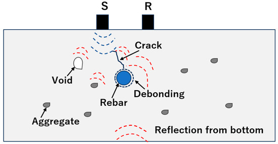 Ultrasonic testing is a powerful non-destructive method for evaluating the condition of steel rebars in reinforced concrete structures. Figure 7 shows the approach of ultrasonic testing. It operates by sending high-frequency stress waves into the material and analyzing their propagation, reflection, and attenuation to assess internal conditions.