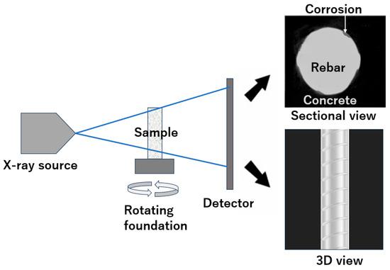 X-ray tomography, particularly X-ray computed tomography(X-CT), has become a powerful non-destructive tool for evaluating the internal condition of steel rebars in reinforced concrete structures [42,43,44,45]. It utilizes X-rays to generate a series of radiographic images from different angles. These two-dimensional projections are then computationally reconstructed into a high-resolution, three-dimensional view of the material’s internal structure. X-ray tomography enables a direct visualization of the rebar’s geometry, surface morphology, and any internal defects or abnormalities that may be present due to corrosion.