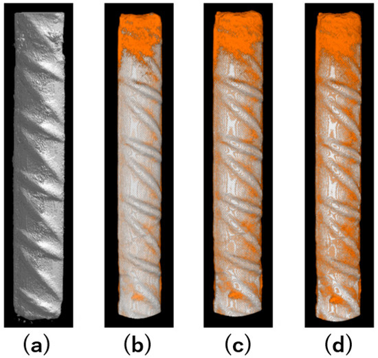 The 3D X-ray micro-CT visualization of steel rebar, based on ref. [46]: (a) before corrosion acceleration experiment, (b) 14th day of the experiment, noticeable first corrosion changes within the rebar, (c) 42nd day of the experiment, and (d) 70th day of the experiment.