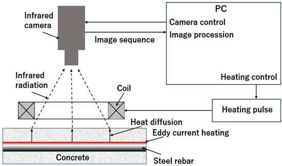 Figure 10 shows the schematic setup of the eddy current heating infrared thermography method to evaluate the corrosion of steel rebar [56]. A coil is positioned above the concrete surface. When an alternating current is applied to the coils, eddy currents are induced within the steel rebar. The eddy current generates localized heating in the rebar due to its electrical resistance (Joule heating). The heat generated in the steel rebar diffuses outward through the surrounding concrete. Any variations in the diffusion pattern—caused by corrosion or defects—affect the temperature distribution on the concrete surface. An infrared (IR) camera is used to monitor the surface temperature changes by capturing the emitted infrared radiation. The camera records a sequence of thermal images showing how the heat propagates over time. A PC controls the system, including both the heating pulse (timing and intensity) and the infrared camera. The captured image sequence is processed on the PC to analyze thermal contrasts and detect anomalies associated with corrosion.