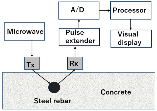 Ground penetrating radar (GPR) is a non-destructive testing method that utilizes electromagnetic waves to image the interior of materials [57,58,59]. Figure 11 shows a schematic diagram of the GPR system. The microwave source generates high-frequency electromagnetic pulses (usually in the range 10 MHz to 2.6 GHz), and the transmitter (Tx) antenna directs the microwave signal into the concrete structure. As the signal penetrates the concrete, it interacts with embedded objects, such as steel rebar. The presence of steel rebar causes part of the microwave signal to reflect due to its different dielectric properties. The level and characteristics of this reflection can be affected by corrosion, which alters the electrical and magnetic properties of the rebar [60,61,62]. The receiver (Rx) antenna captures the reflected microwave signals after interacting with the steel rebar. The time delay and amplitude of the received signal provide information about the depth and condition of the rebar. The pulse extender enhances and shapes the received signal for better analysis and resolution. It helps distinguish between reflections from different layers or objects. The A/D converter (analog-to-digital converter) converts the analog microwave signals into digital data for computational processing. The processor analyzes the digitized signals to extract meaningful information about the location and condition of the steel rebar. It may apply signal processing techniques like filtering, deconvolution, or time-domain analysis. The visual display presents the processed data as images or graphs. It typically shows rebar position, potential corrosion zones, or signal amplitude vs. depth.