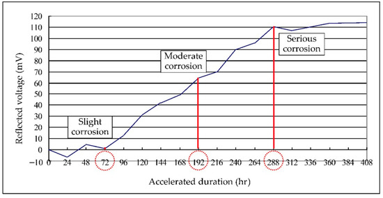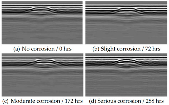 Figure 12 shows the GPR scanning profile of steel rebar with different corrosion levels [64]. Since the ground penetrating radar (GPR) profile presents a simulated signal image, visual differences between corrosion states are not readily apparent. Therefore, corrosion assessment in this study relies on coded signal analysis. The reflected electromagnetic wave voltage from steel bars embedded in concrete was examined at various stages of accelerated corrosion (ranging from 0 to 408 h). GPR results indicated that during the selected corrosion durations of 72, 192, and 288 h, the reflected voltage varied according to the extent of corrosion, as illustrated in Figure 13. These findings demonstrate that the degree of corrosion increases with longer exposure to the accelerated corrosion process.