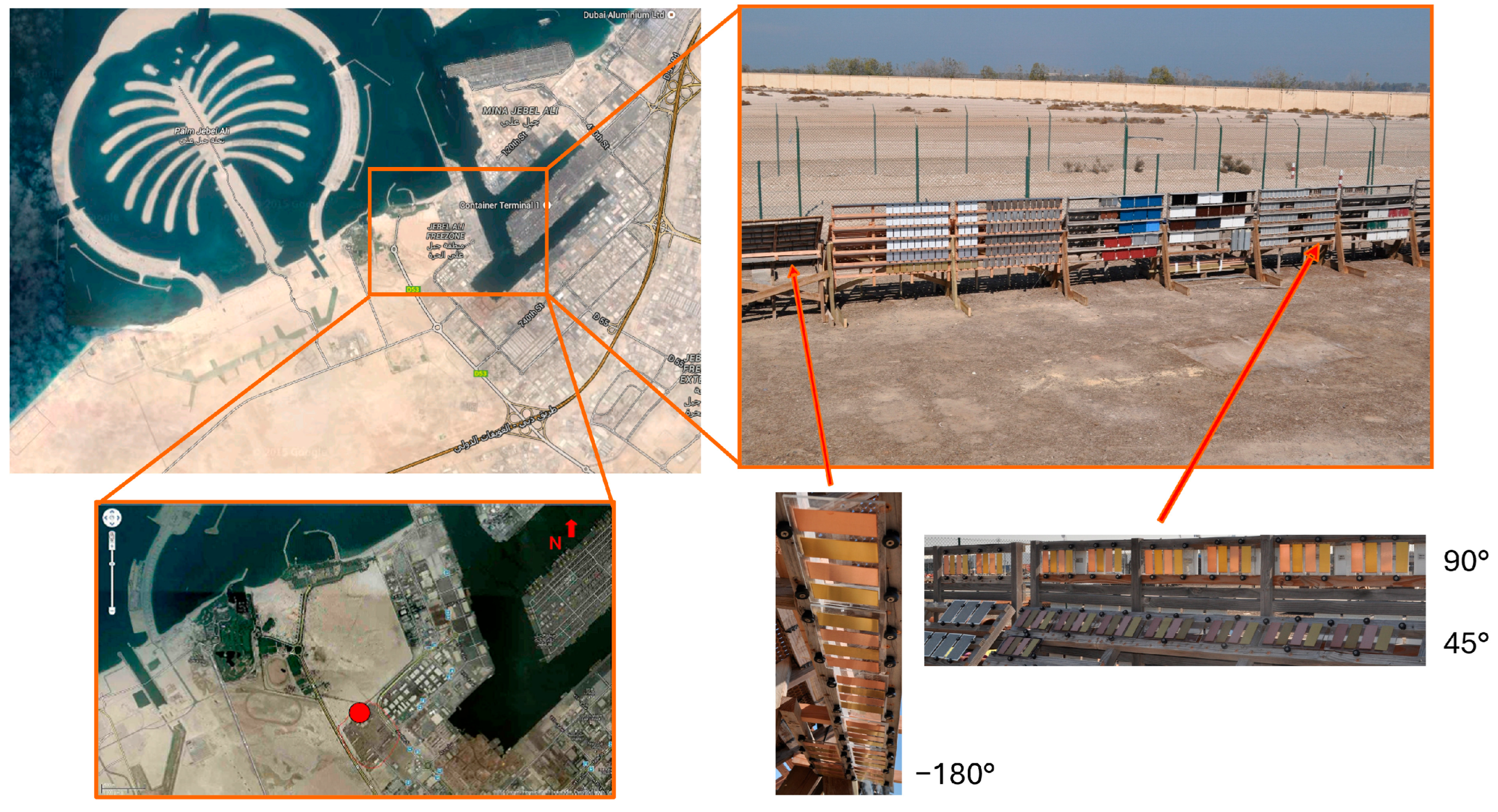 Aesthetic changes (and stereomicrograph images after 4 years), similar to those observed for Cu metal and the alloys in Dubai, have previously been reported by the authors for the same alloys when freely exposed at inclinations of 45° and 90° at sites located approximately 1.5 km (site 3) and 40 km (site 4) from the marine seashore of Brest, France [