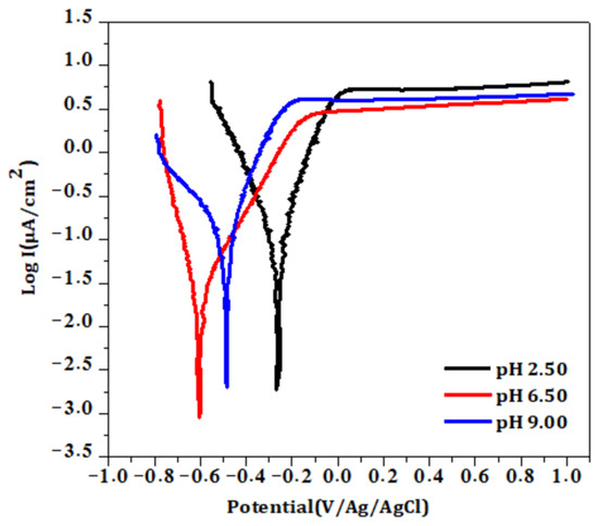 | pH | Ecorr (mV/ Ag/AgCl) | Icorr × 10−9 (A·cm−2) | Average Tafel Slope (mV dec−1) | RP × 106 (Ω·cm2) | Ipass × 10−6 (A·cm−2) | |