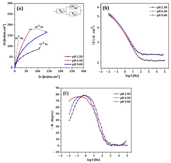 | pH | Rel (Ω·cm2) | CPEdl × 10−6 (Ω−1·cm−2·sn) | n | Rct (kΩ·cm2) | Chi-Squared |