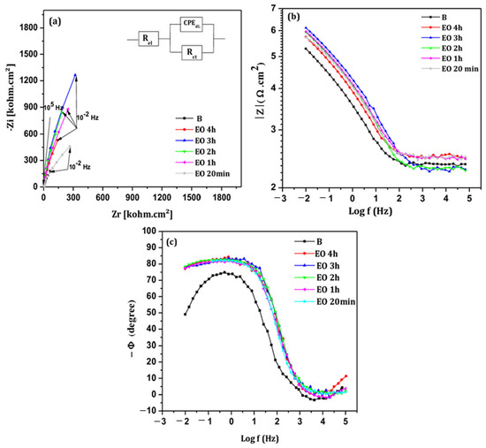 | EO 1 h | −293 ± 15 | 7 ± 0.4 | 308 ± 15 | 152 ± 8 | 6.31 ± 0.63 | 0.52 ± 0.03 |