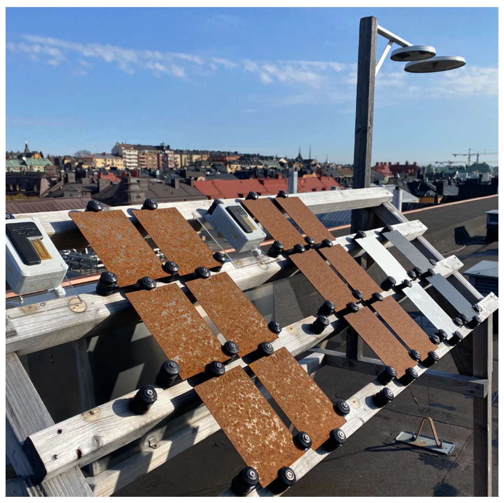 3]. The effects-based monitoring using the network of test sites should be expanded, for example, by adding new sites and materials. Weathering steel was recently exposed for longer periods and for comparison with carbon steel corrosion. Forthcoming results of this material will make it possible to draw conclusions regarding the long-term trends. The most recent addition is Zn-Al-Mg coatings with withdrawal after one year of exposure at the end of 2025. Another possible extension is to use corrosion sensors at a larger portion of the test sites, thus enabling the systematic collection of time-resolved data [