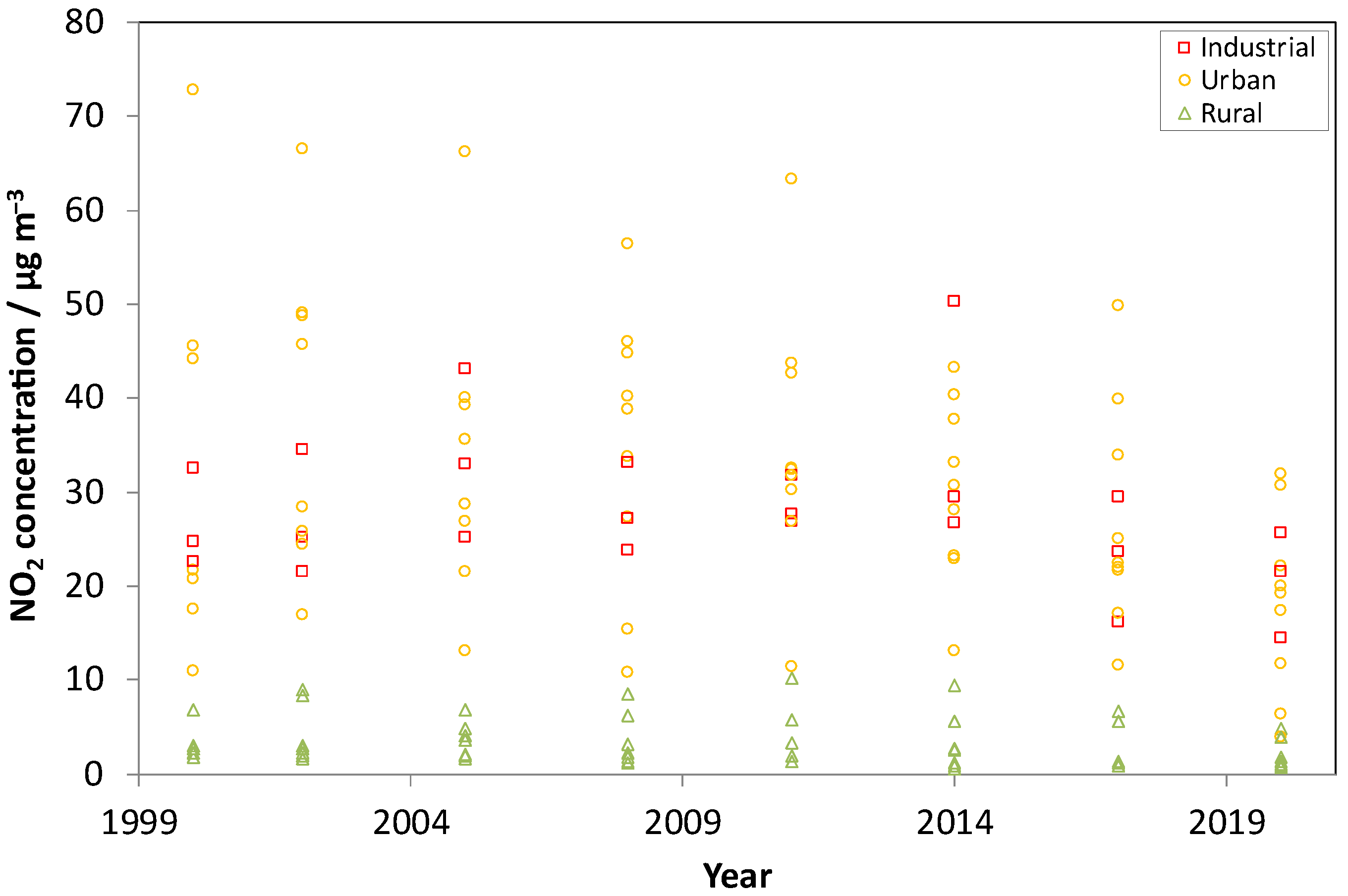 2 concentrations at industrial, urban, and rural sites from the year 2000 to 2020. For industrial sites the levels have dropped below 10 µg m