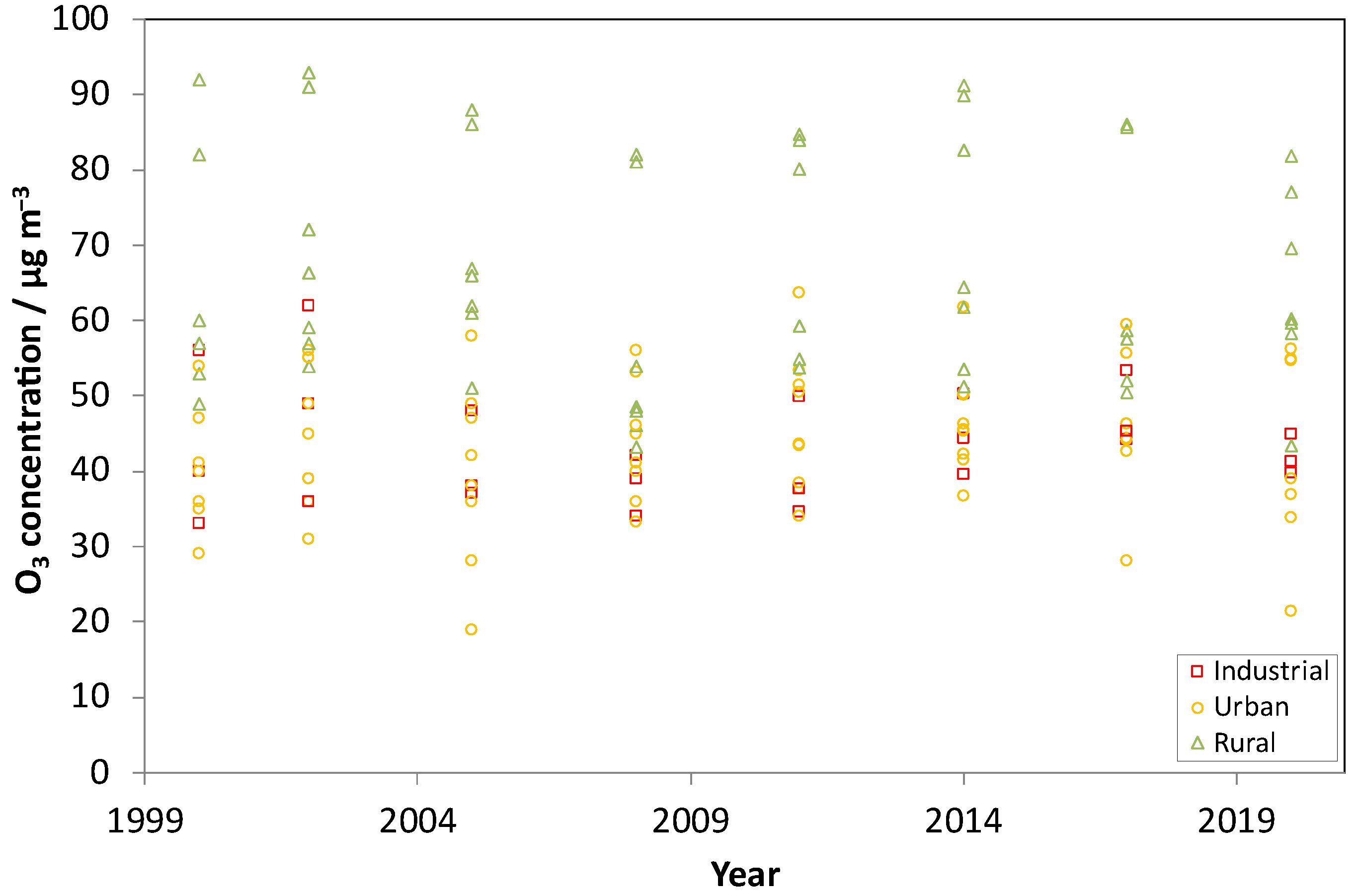 3 has been measured by the network since 2002, the year in which PM10 was also included, however, as a non-mandatory parameter. The limited amount of data points, especially for PM10, does not allow a comparison between urban, industrial, and rural sites. Examining three individual sites,